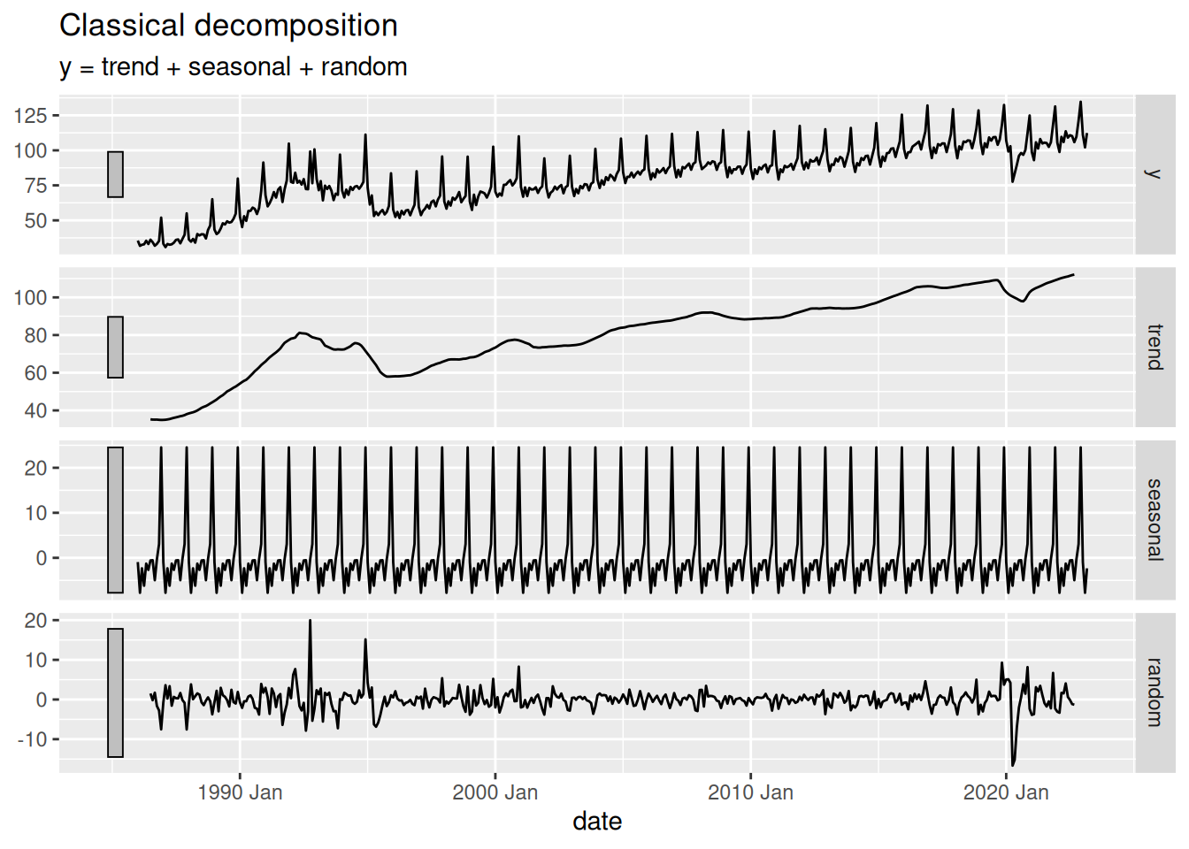 fableThe code is basically the same as for the classical decomposition. We just need to change the model used inside the model() function.
