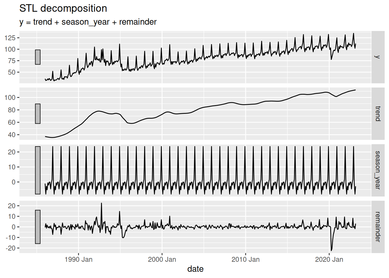 STL() function, we can specify the formula for the decomposition, or don’t specify it at all. See ?STL for more details.