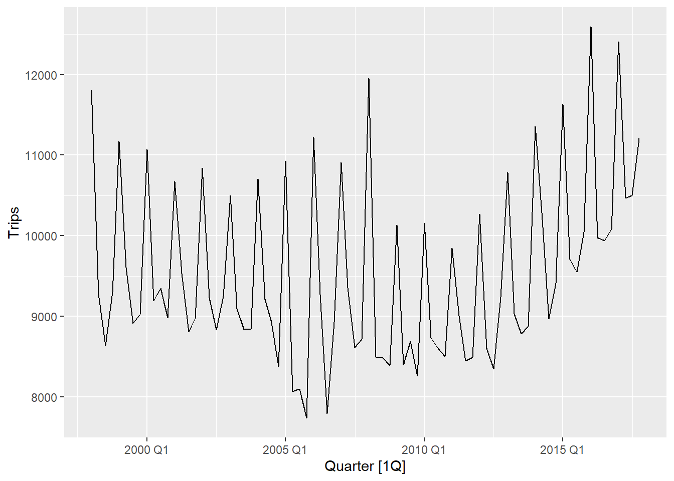 autoplot(aus_holidays, level = NULL) + xlab("Year") +