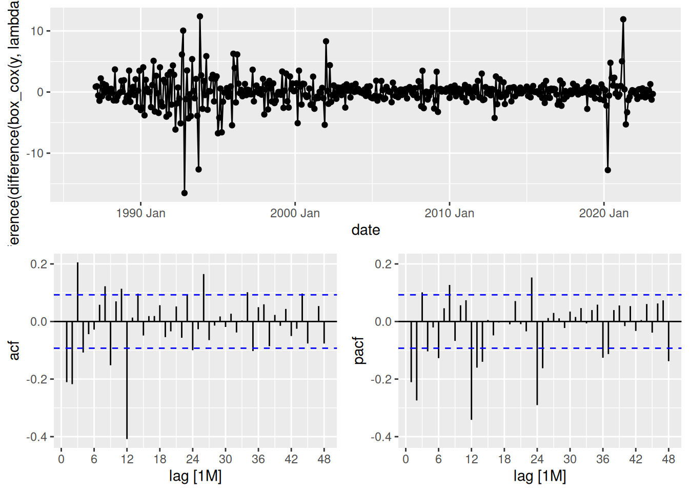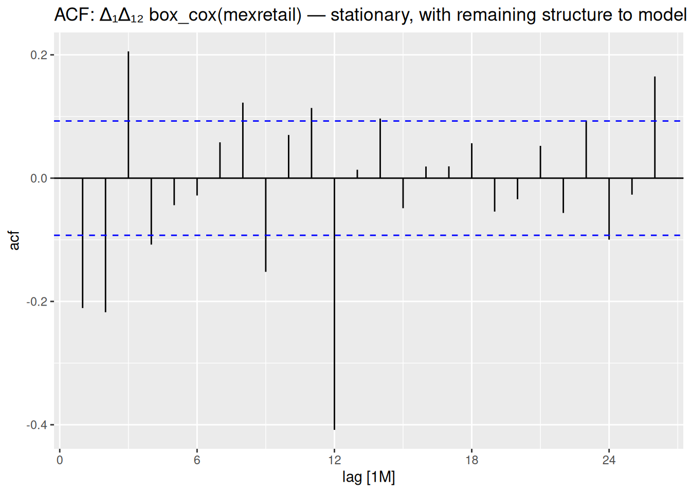 mexretailmexretail has trend, seasonality, and growing variance. The full differencing pipeline: