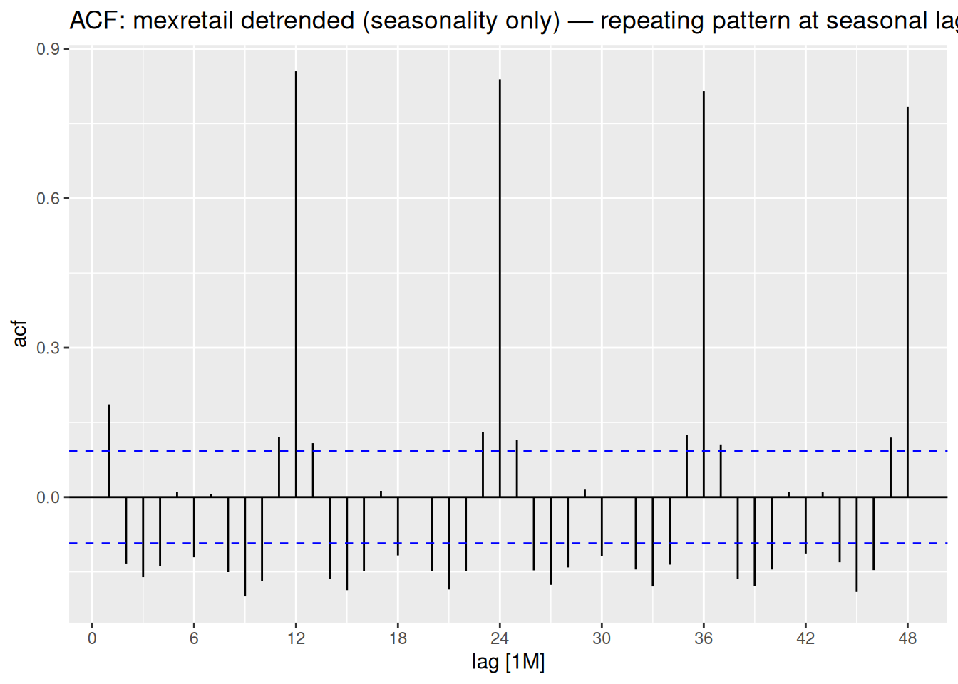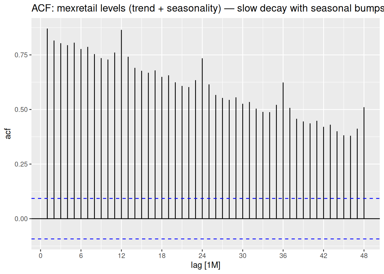 box_cox(y, lambda)unitroot_nsdiffs() → 1unitroot_ndiffs() → 1difference(box_cox(y, lambda), 12) |> difference(1)We have already encountered the ACF when diagnosing residuals from our benchmark models — checking whether leftover errors looked like white noise. Here we use it for a different but related purpose: understanding the correlation structure of the series itself.