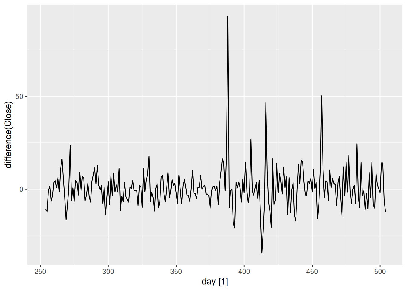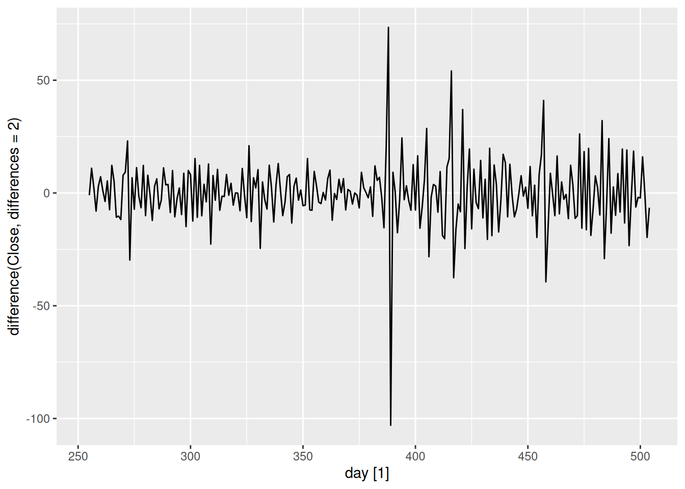 1 autoplot(difference(Close, differences = 2))differences = 2 tells difference() to apply the differencing operation twice.