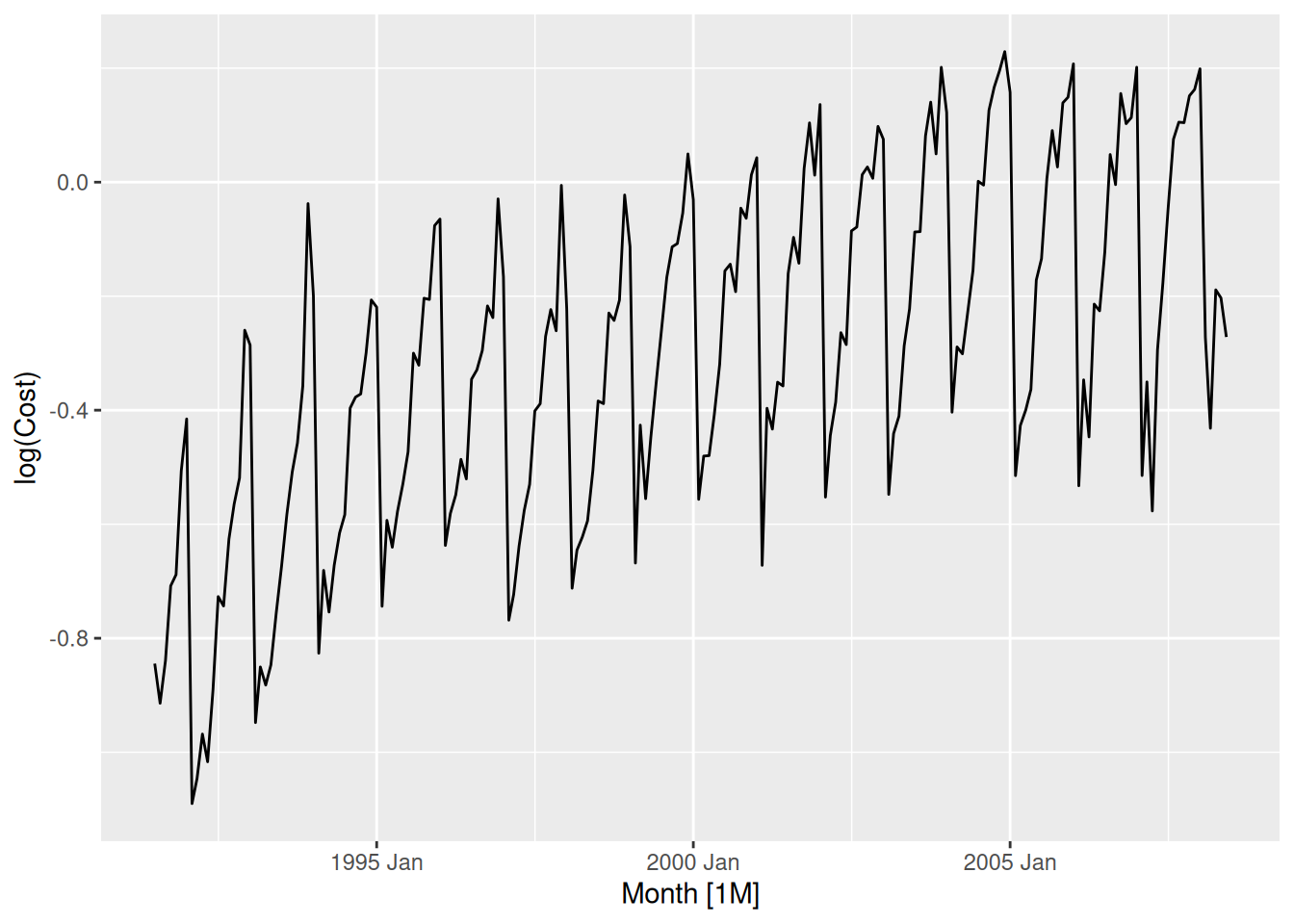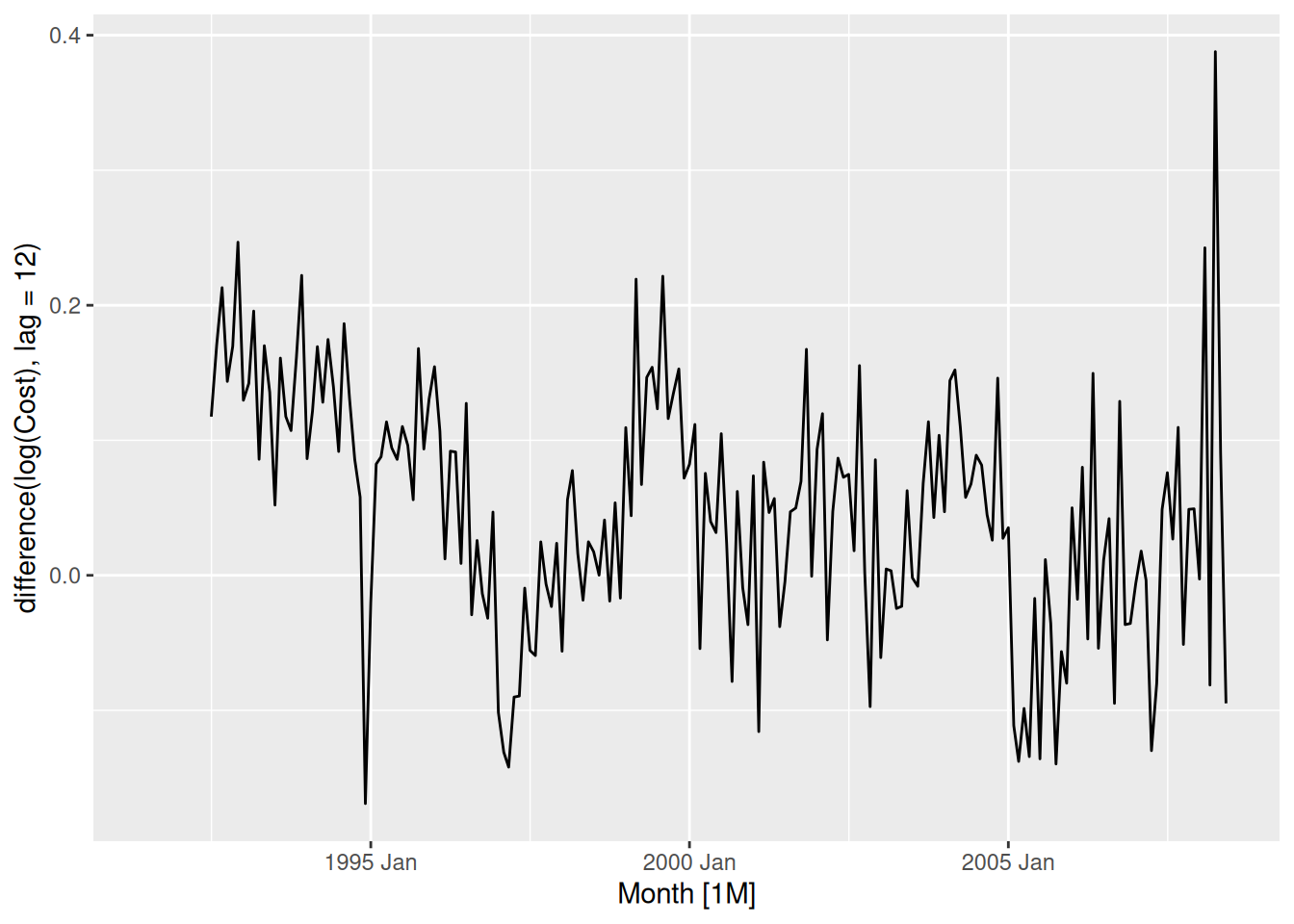 1 autoplot(difference(log(Cost), lag = 12))lag = 12 tells difference() to compute the seasonal difference with a lag of 12 periods (i.e. y_t - y_{t-12}). If no lag is specified, it defaults to 1 (the first difference).