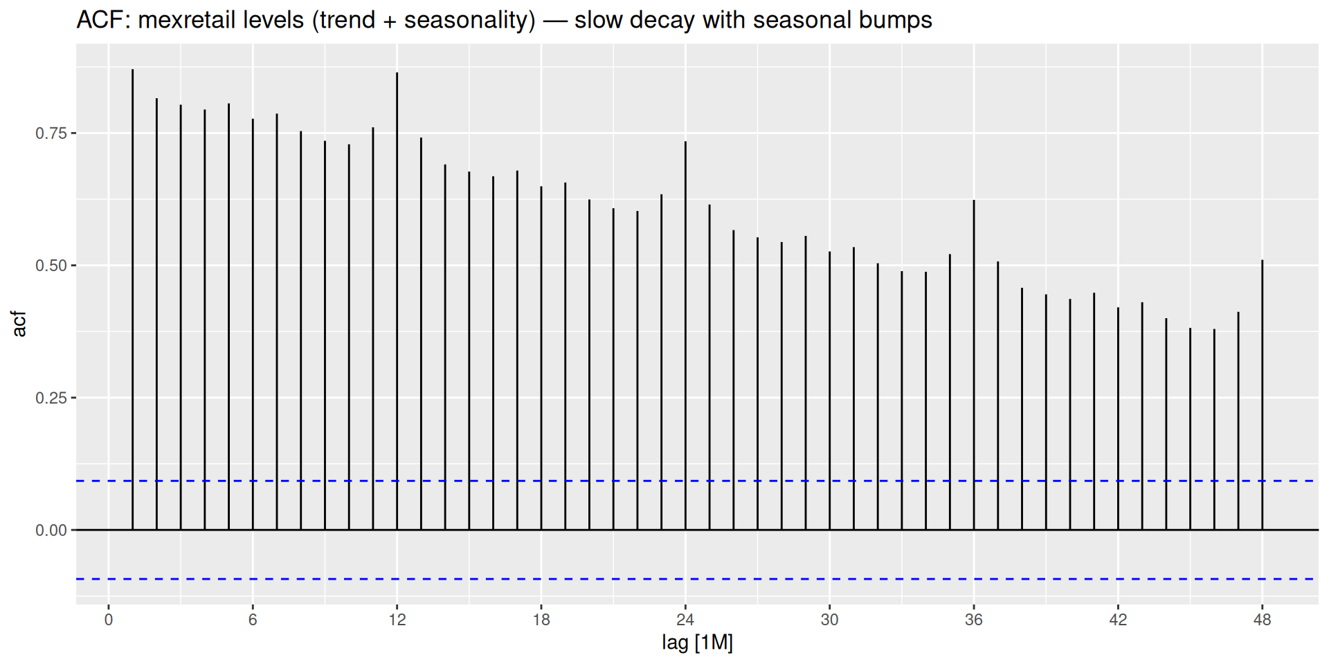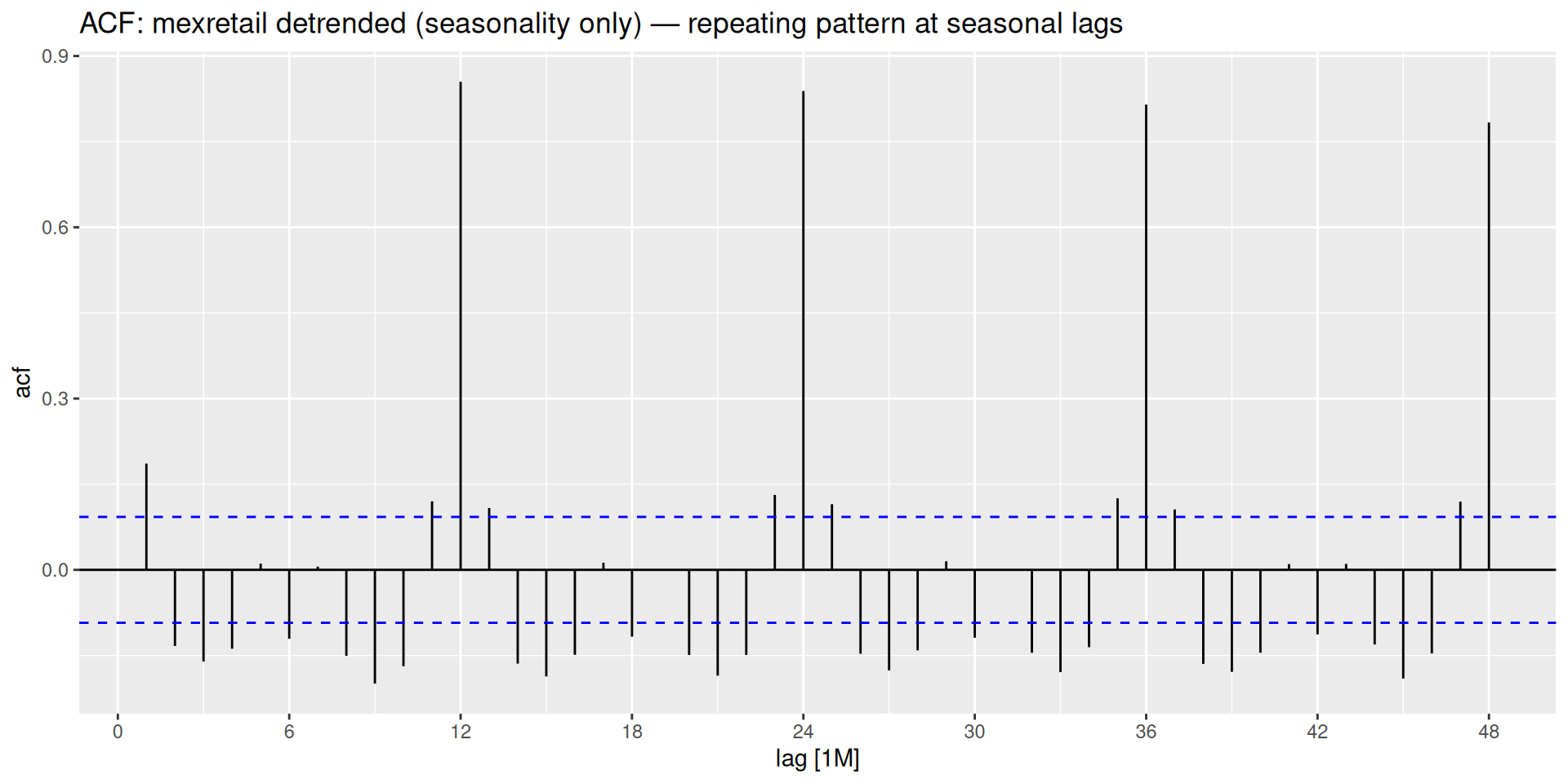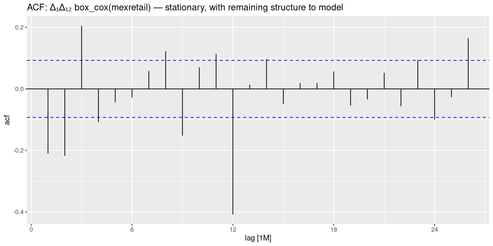 box_cox(y, lambda)unitroot_nsdiffs() → 1unitroot_ndiffs() → 1difference(box_cox(y, lambda), 12) |> difference(1)We have already encountered the ACF when diagnosing residuals from our benchmark models — checking whether leftover errors looked like white noise. Here we use it for a different but related purpose: understanding the correlation structure of the series itself.