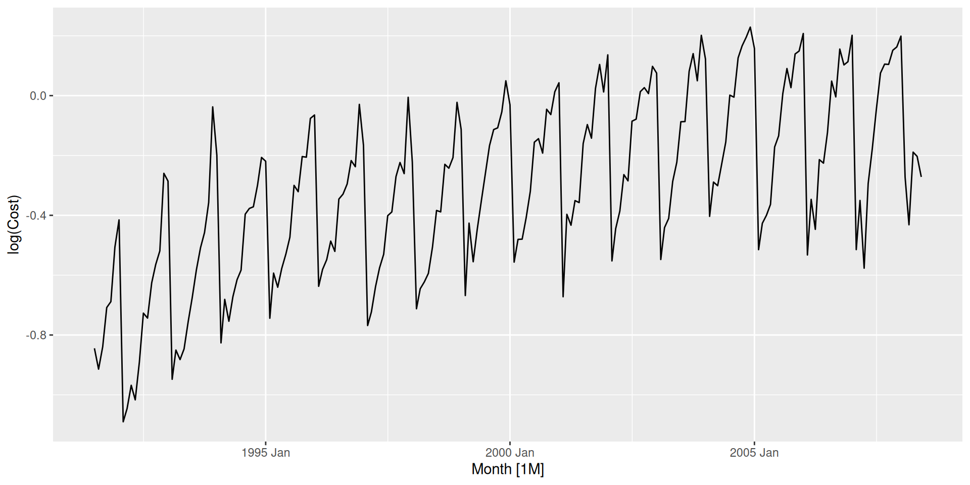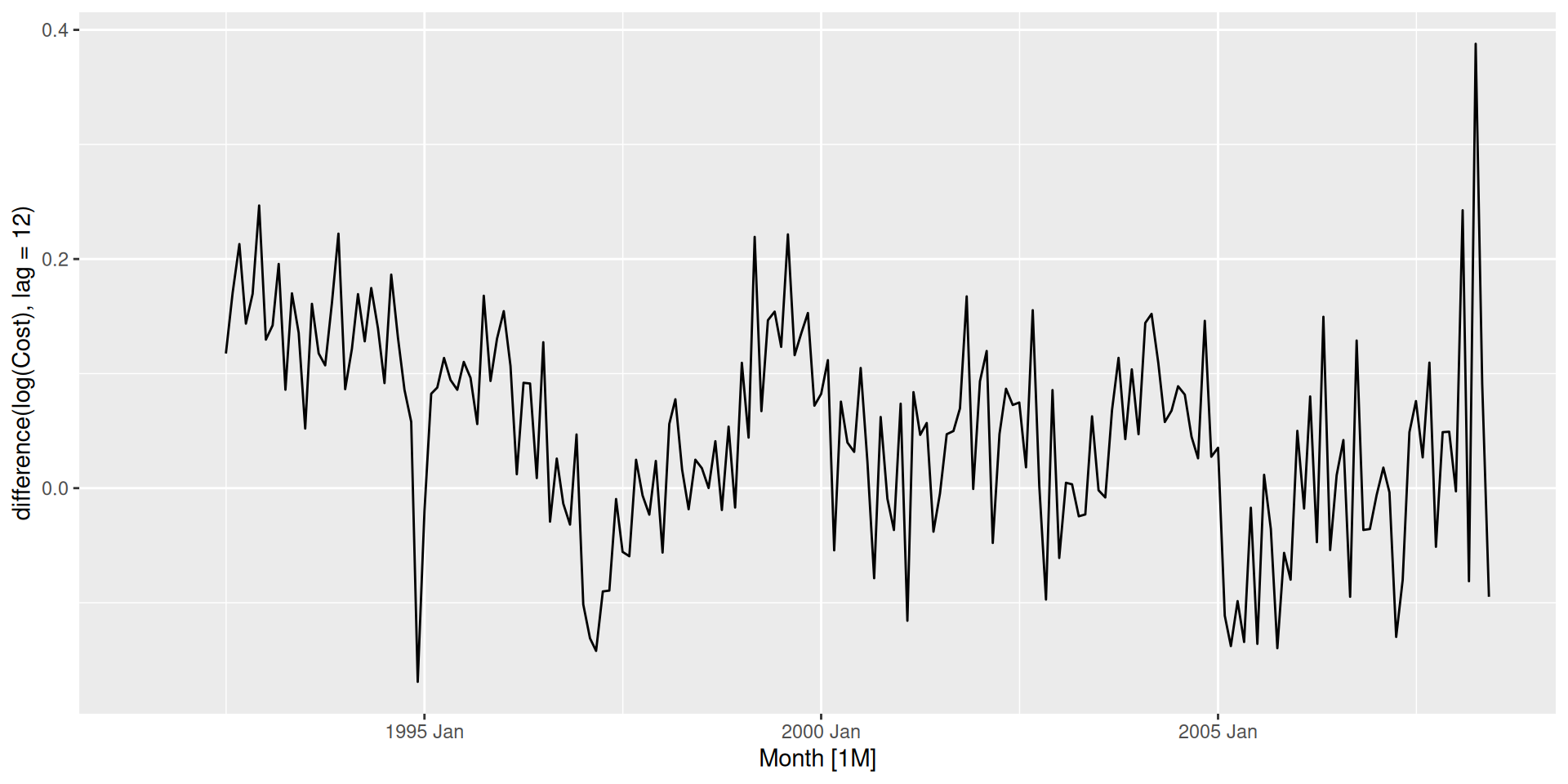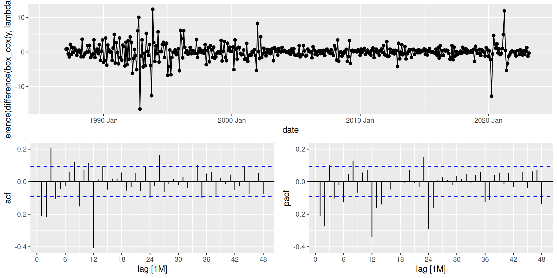 mexretailmexretail has trend, seasonality, and growing variance. The full differencing pipeline: