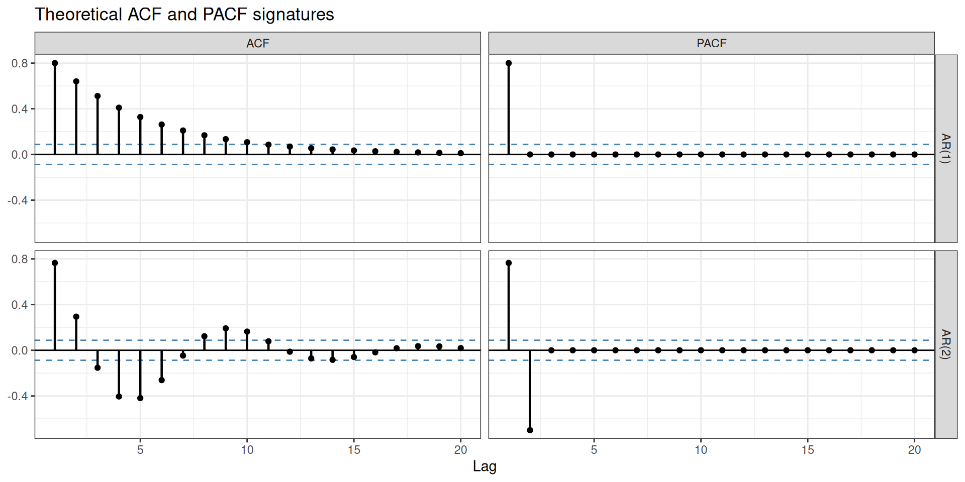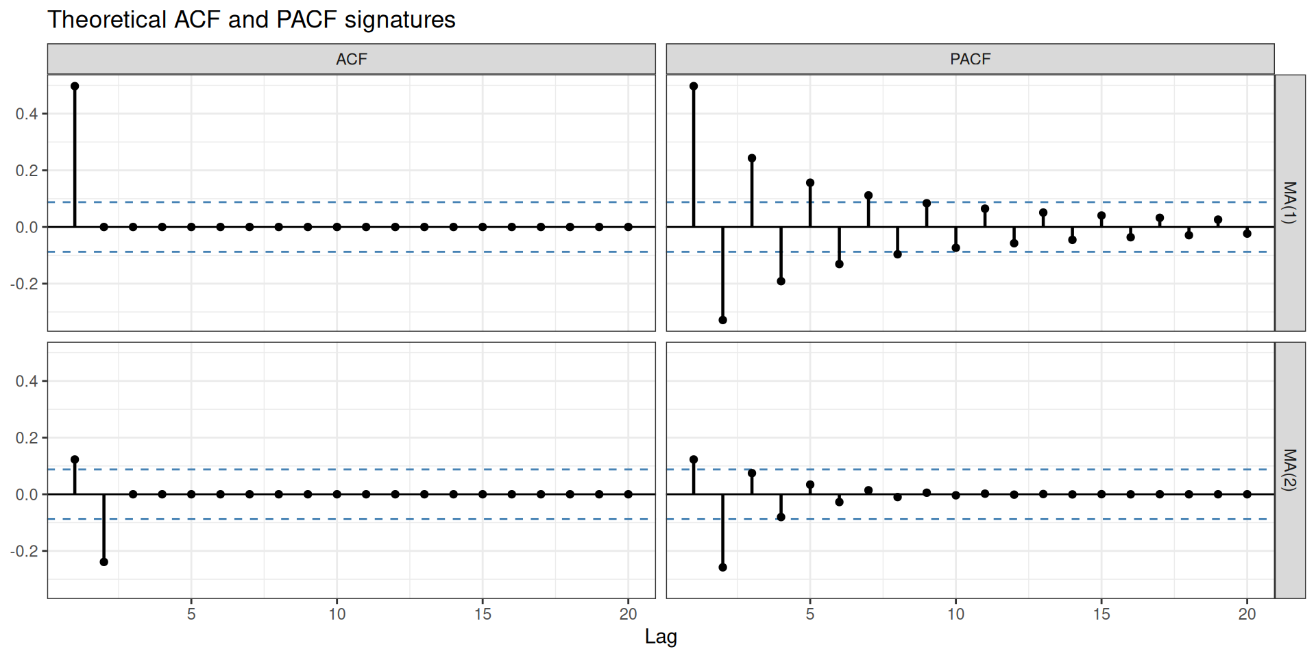 In practice, you will rarely use a pure AR or pure MA model. Real series typically need both. And most real series also need differencing before any of this applies.