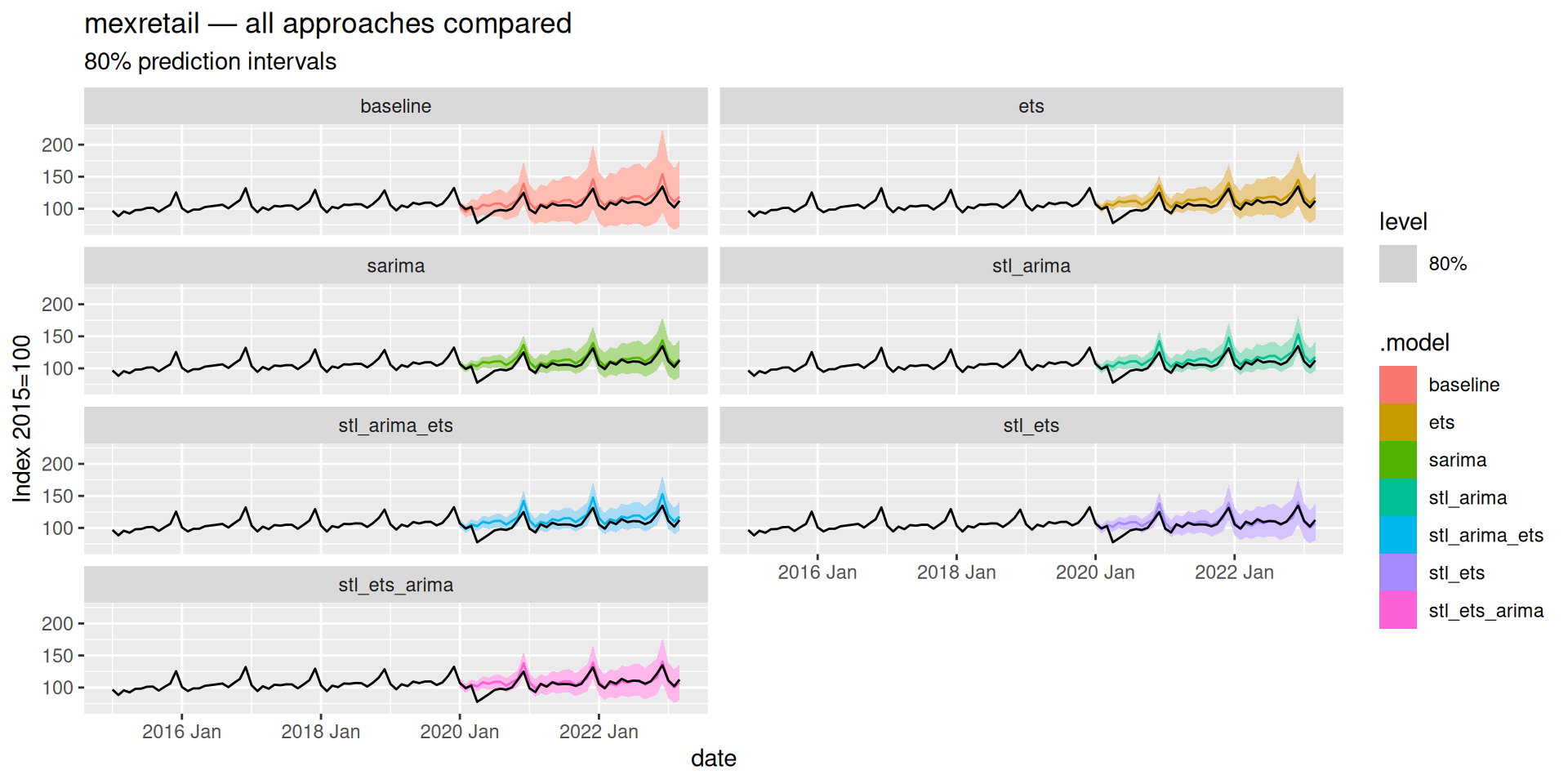 Compare the ranking here against mexretail. Does the same approach win on both series? What does that tell you about when mixed decomposition models add value — and when they don’t?