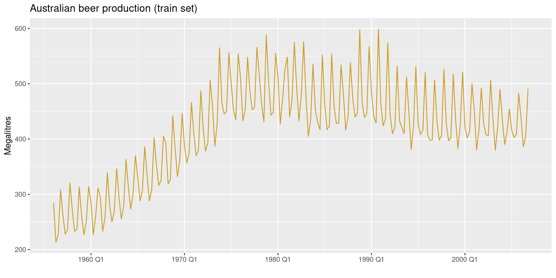 To check whether the rankings hold on a different series, we apply the same workflow to quarterly Australian beer production from fpp3: