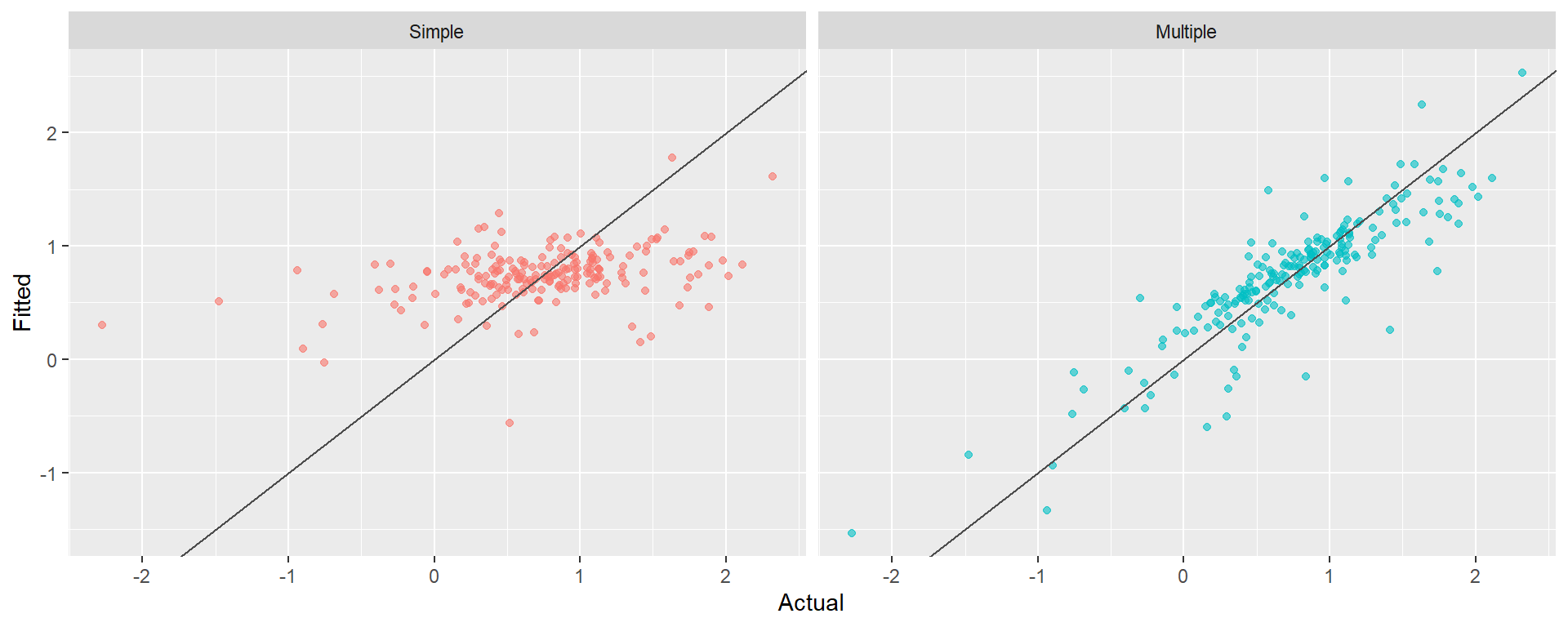 The multiple model substantially improves fit (\bar{R}^2 goes from ~0.15 to ~0.75) and the residuals look much closer to white noise.