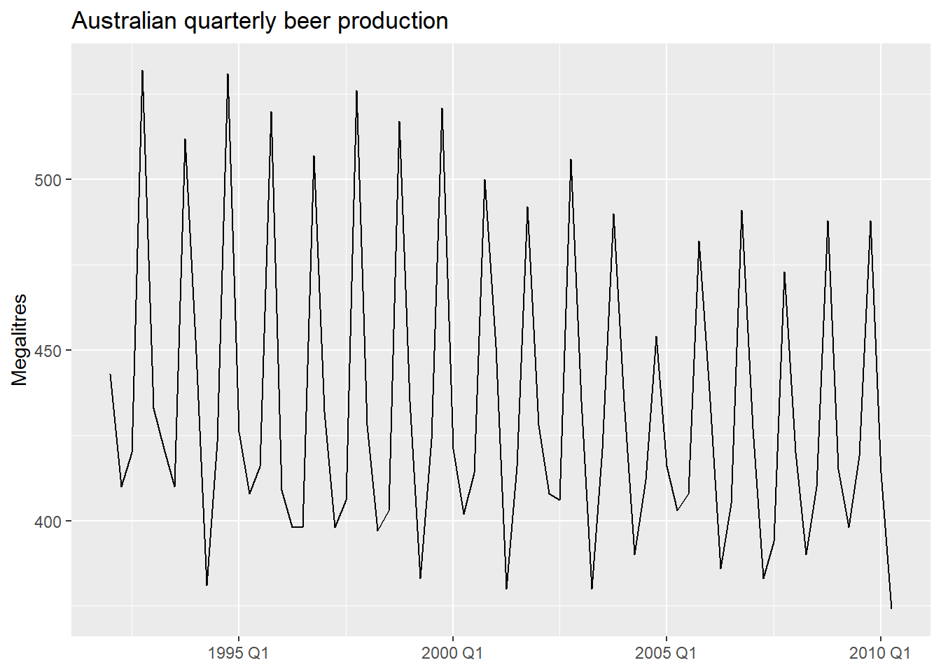 trend()adds a linear time index;season()adds quarterly dummy variables.