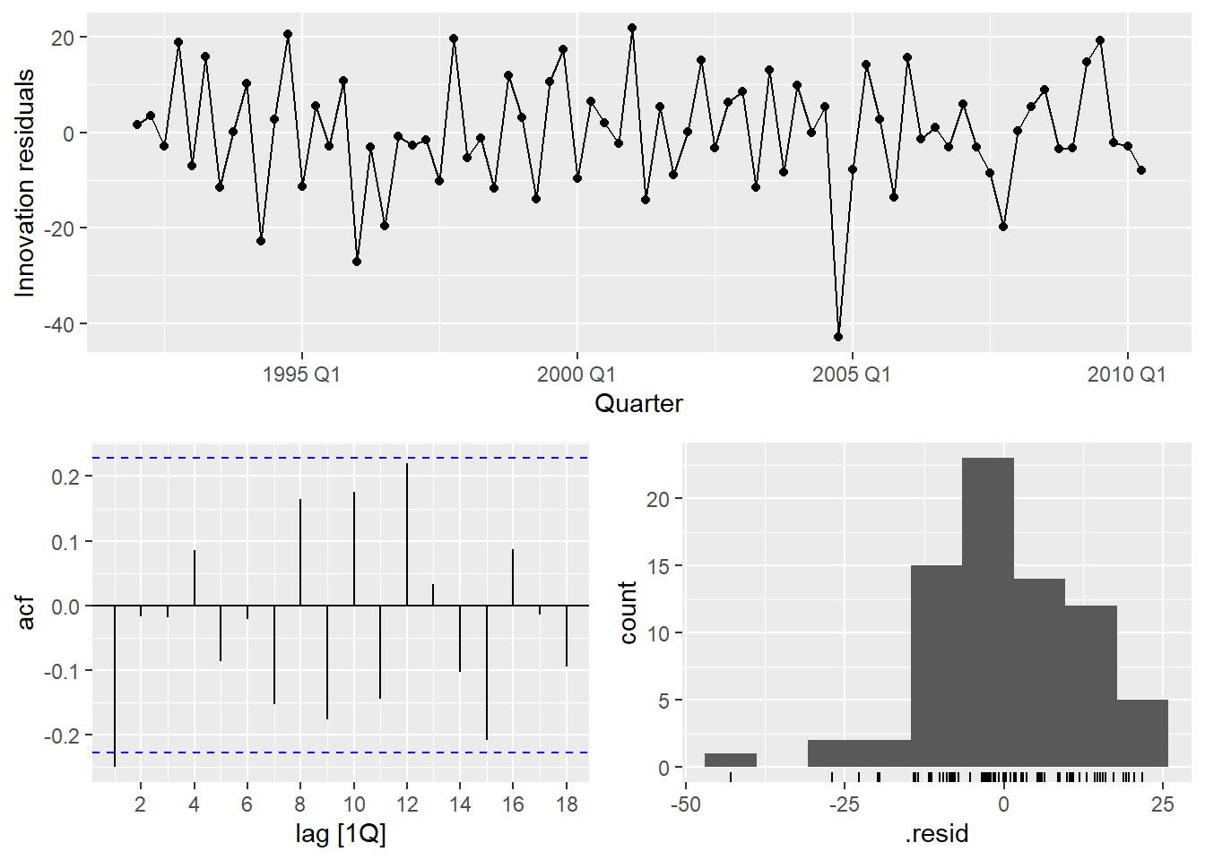 There is a notable outlier in Q2 1994. We can handle it with an intervention variable.