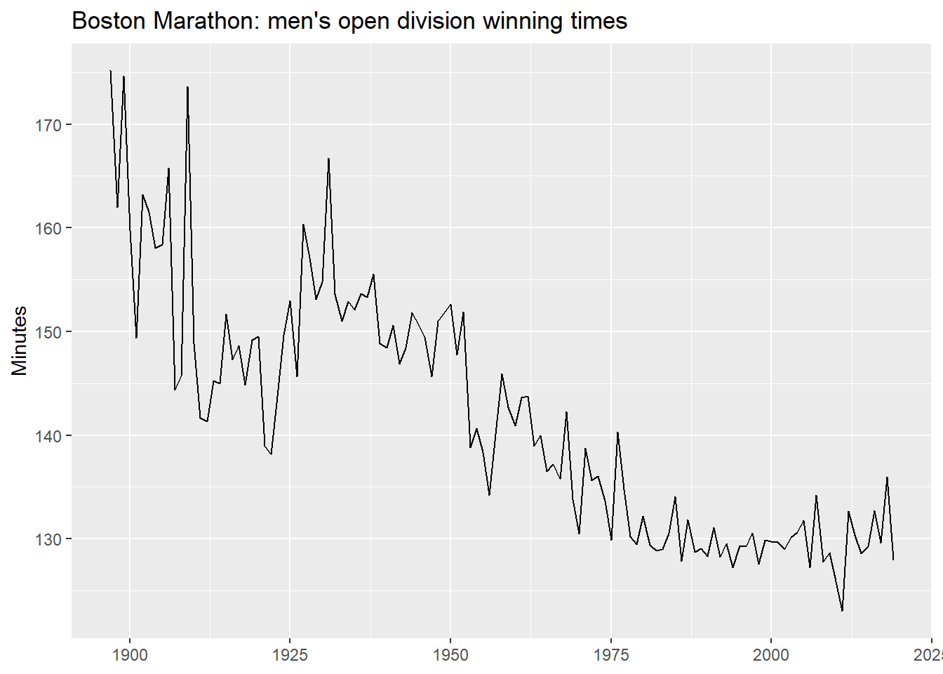 We use the Boston Marathon winning times as an example — a series with clear structural breaks.
