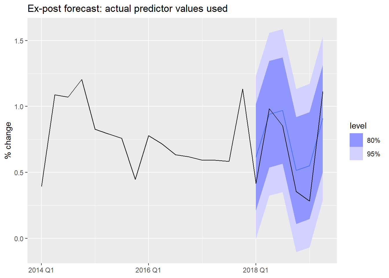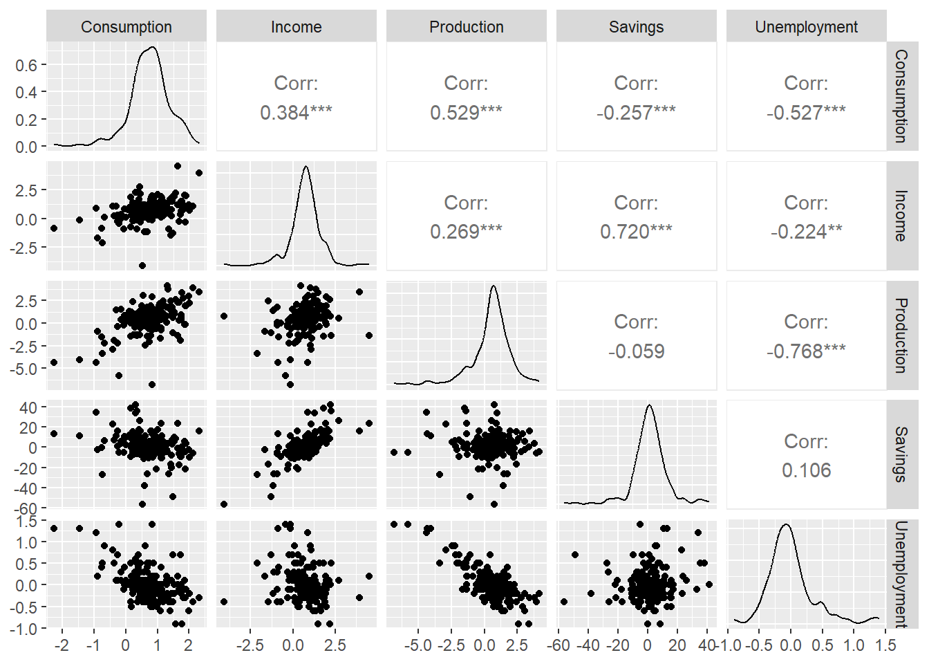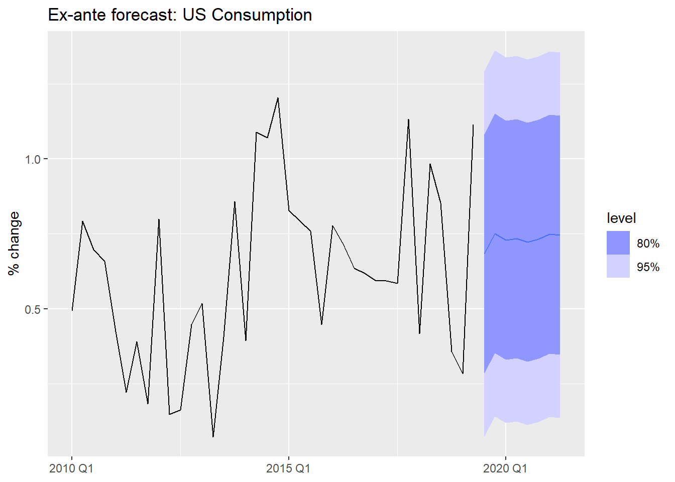 We will use us_change — quarterly percentage changes in US macroeconomic variables. Our forecast variable is Consumption.